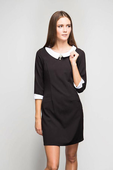 ОписаниеОчаровательное черное платье с белым воротником и манжетами. Модель средней длины, с рукавами 3/4. В комплекте съемная брошка!